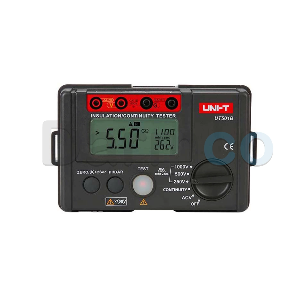 میگر یا تستر مقاومت عایق یونیتی مدل UT501B مطابق با استاندارد ایمنی CAT III 600V طراحی و ساخته شده است و برای اندازه گیری مقاومت عایق ها، ولتاژهای متناوب در بازه 30 تا 600 ولت با خطای 2% به کار میرود. این میگر با ایجاد جریان اتصال کوتاه کمتر از 2 میلی آمپر و ولتاژهای بالا، قادر به اندازه گیری مقاومت های کوچک قطعات مدار از 0.01 اهم تا 200 اهم با 2% دقت می باشد.این میگر دیجیتال میتواند تست DAR یا جذب الکتریکی بین 60s/15s و 60s/30s و PI یا فهرست یا پولاریزاسیون مواد را اندازه گیری کند. تغییر رنج آن بصورت خودکار بوده و نشانگر کاهش باتری را دارد. دارای نور پس زمینه، آلارم نوری، تست بیزر و هشدار ولتاژ بالا می باشد. از میگر UT501B در تست تعمیر مدارها ی تجهیزات الکترونیکی و حفظ و نگهداری وسایل الکترونیکی مختلف استفاده می شود. صفحه نمایش این میگر رنج اندازه گیری لازم را پوشش می دهد. این میگر ساخت برند یونیتی برای اندازه گیری و سنجش مقاومت متریال عایق بکار رفته در ترانسفورماتور ها و در موتور ها و همچنین در تست عایق و ایمنی کابل های برق و کلید پریز ها و سایر لوازم الکتریکی و.... قابل استفاده است.